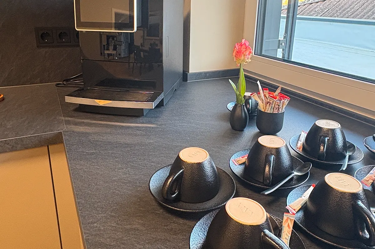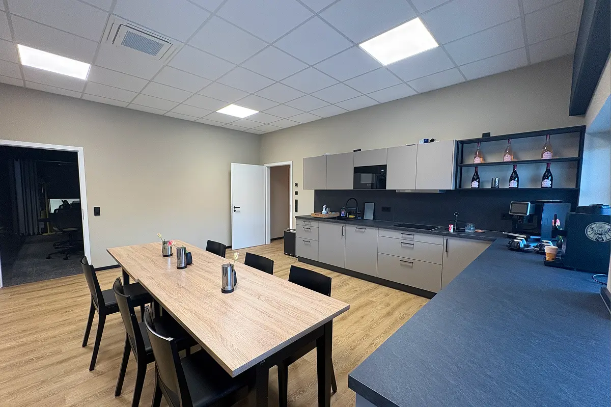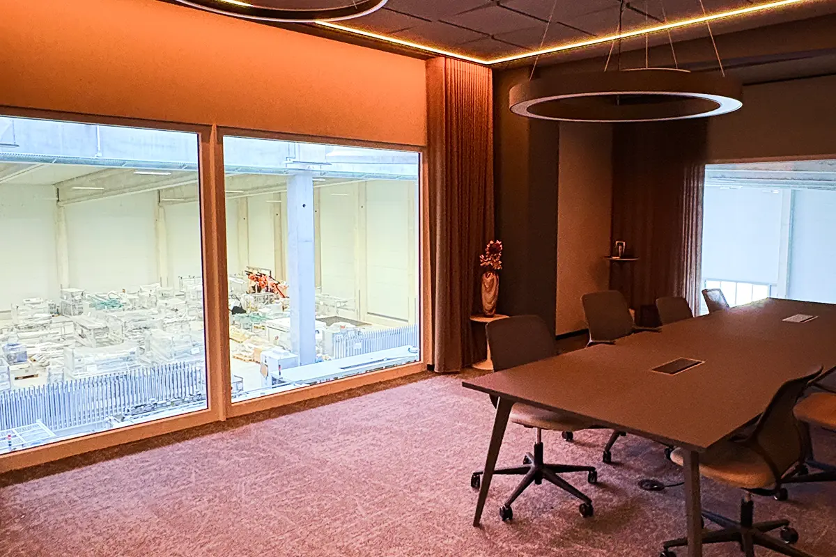 Der Future Campus ist gezielt auf Austausch, Weiterbildung und Zusammenarbeit ausgerichtet. Ein höhenverstellbarer Konferenztisch, Beamer, Leinwand sowie ein Blackboard schaffen optimale Voraussetzungen für Präsentationen und kreative Workshops. Ergänzt wird die Ausstattung durch eine moderne Küche mit Getränken und Kaffeespezialitäten, die den Teilnehmern Raum für das Energieaufladen liefert. Große Fenster in den Meetingräumen ermöglichen zudem einen Blick auf die derzeit im Aufbau befindliche Produktion.